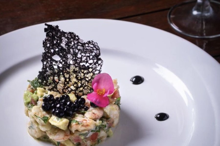 Entre sus especialidades se encuentra un tartar de langostinos frescos del muelle con palta, tomate y cilantro de su quinta, y alineado con emulsión de agua de mar, aceite de sésamo, sal, wasabi y limón, decorado con coral de tinta de calamar y caviar casero.
