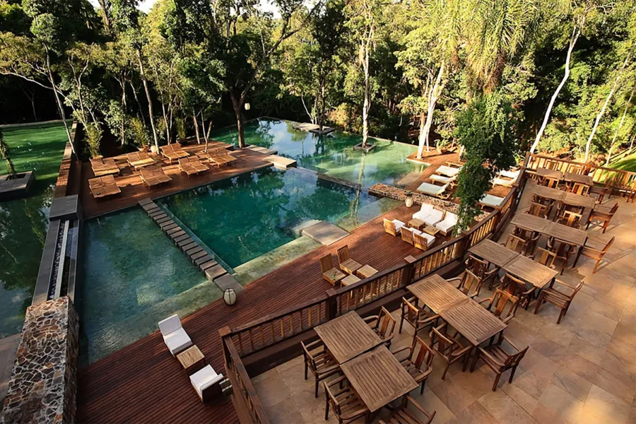 Uno de los puntos más fotografiados del complejo son sus piscinas exteriores, dispuestas en terrazas y rodeadas por una vegetación exuberante, que se funden armónicamente con el paisaje. Para los adultos en busca de un ambiente más sereno, Yvaga, inaugurado en 2023, ofrece una propuesta exclusiva con piscina climatizada y un bar de autor con una carta sofisticada de platos y tragos diseñados para disfrutar sin apuros junto al río Iguazú.